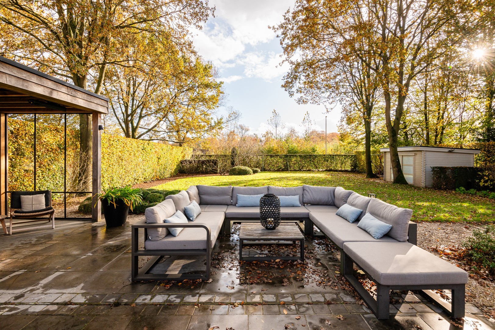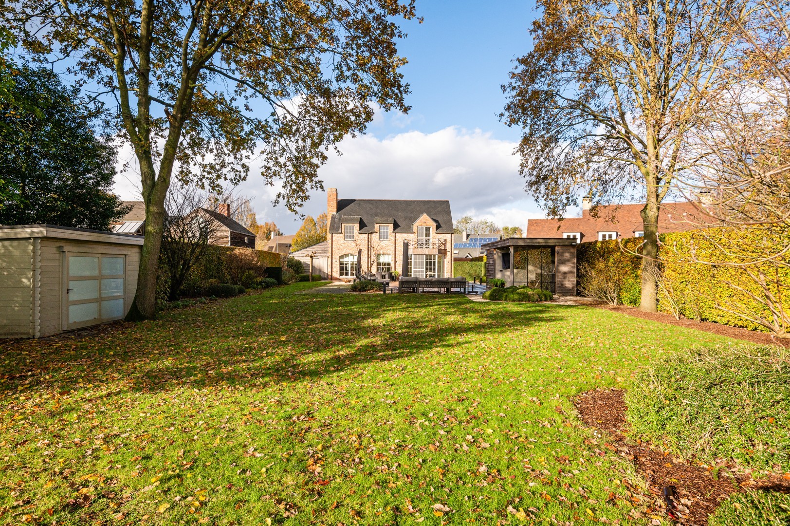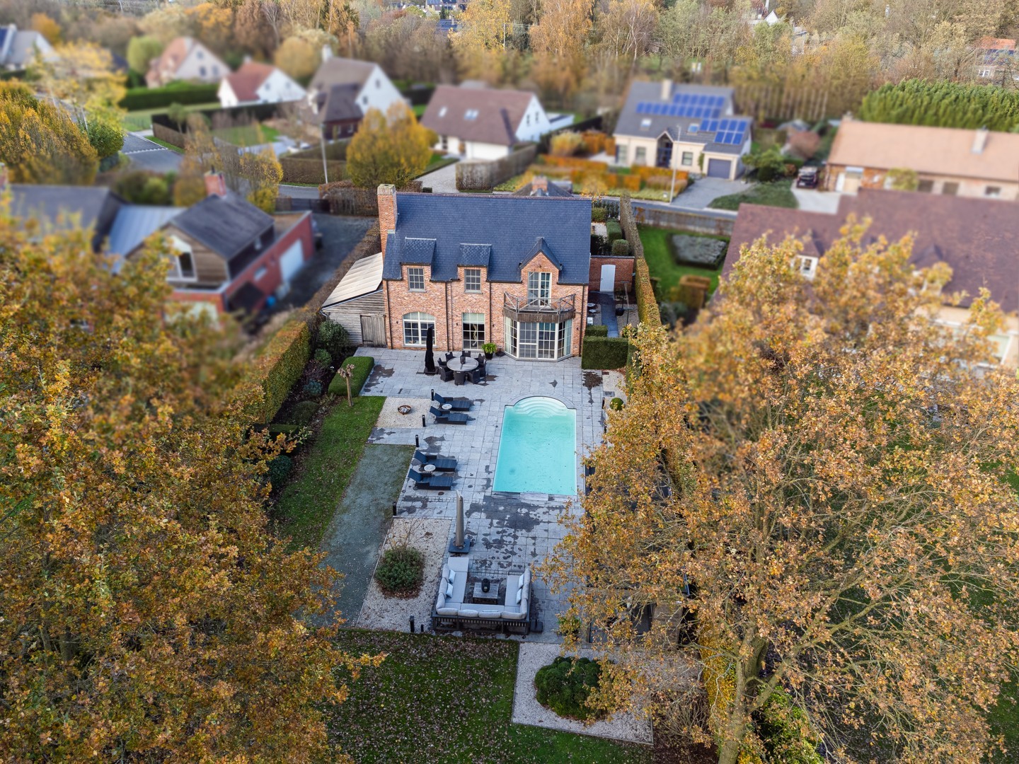 De straat is er één die enkel toegankelijk is voor plaatselijk verkeer waardoor het er zeer rustig en kindvriendelijk is. De grote oprit, afgesloten door een automatische poort, voorziet parking voor verschillende wagens en een carport voor 1 wagen. De grote tuin heeft een ideale Zuid-West oriëntatie, is overal voorzien van tuinverlichting en volledig aangelegd met ondermeer een verwarmd zwembad en petanquebaan. Het poolhouse werd recent gebouwd en is voorzien van een buitenkeuken, inloopdouche en toilet. Daarnaast is er ook nog een ruim tuinhuis en bijkomende tuinberging achter de carport.