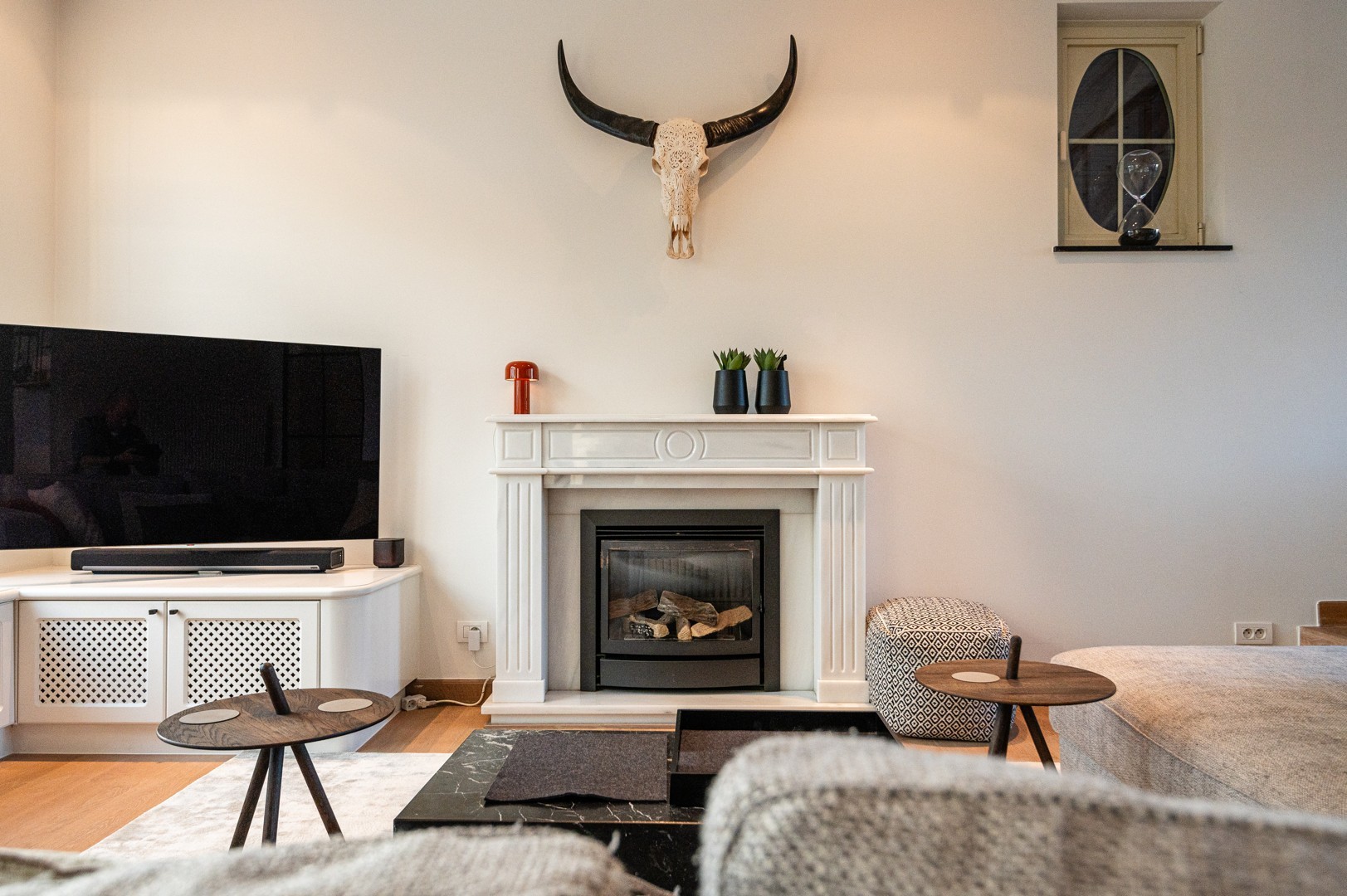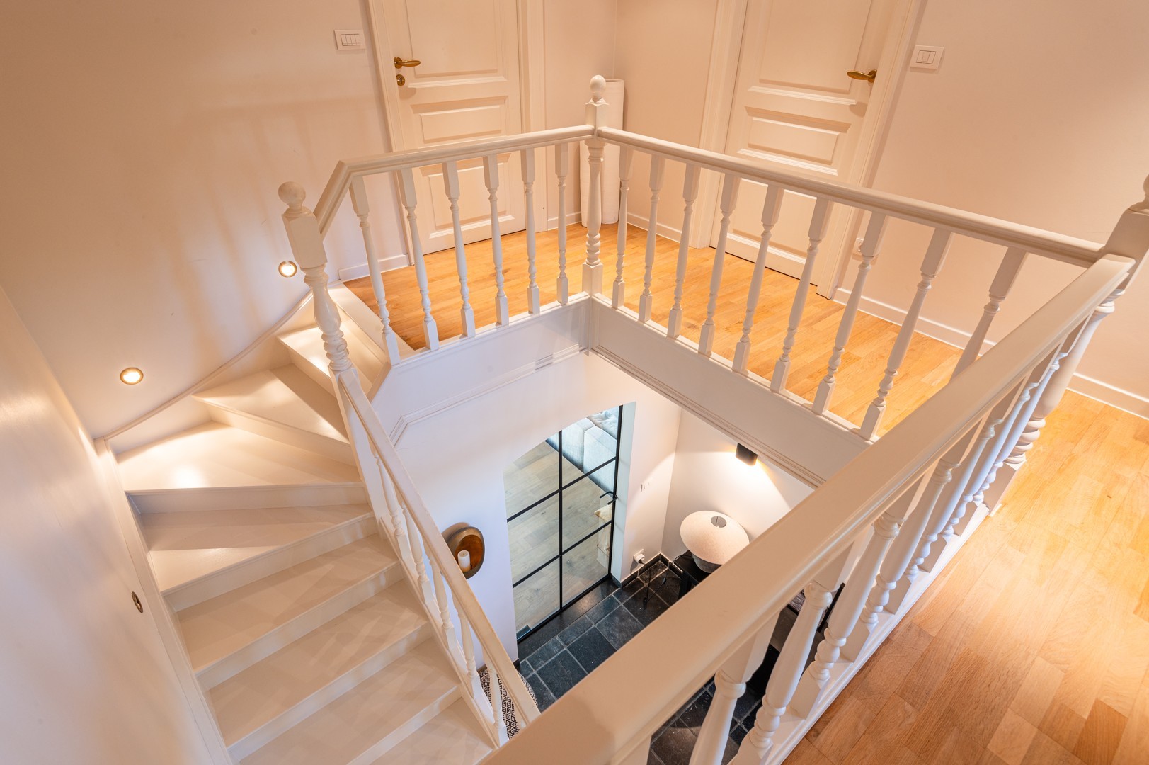 De woning zelf werd heel kwalitatief afgewerkt met veel aandacht voor ruimtegevoel en contact met de tuin. De inkomhal met open, statige traphal is voorzien van een eerste (gasten)toilet. Dankzij de glazen deur in staal is er ook in deze ruimte onmiddellijk connectie met leefruimte en tuin. In de living is er een gezellige zitput met gashaard en aansluitend een grote bureauruimte, opnieuw afgewerkt met grote glasramen in staal. De open keuken met groot eiland is volledig uitgerust en zit aan de andere kant van de leefruimte. Aansluitend aan de keuken is er een praktische wasberging met toegang tot de extra praktijkruimte. Deze is ook van buitenaf afzonderlijk toegankelijk.